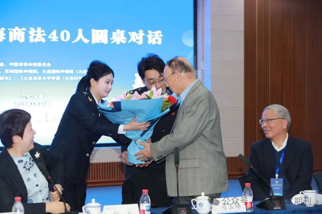 圆桌对话特别设置了“致敬海商法老一辈”环节,回顾和礼赞新中国海商法前辈躬身奠基的壮阔历程。中国海商法教育的奠基人、大连海事大学原校长司玉琢教授在现场接受后辈致敬鲜花,象征着海商法事业的薪火相传。